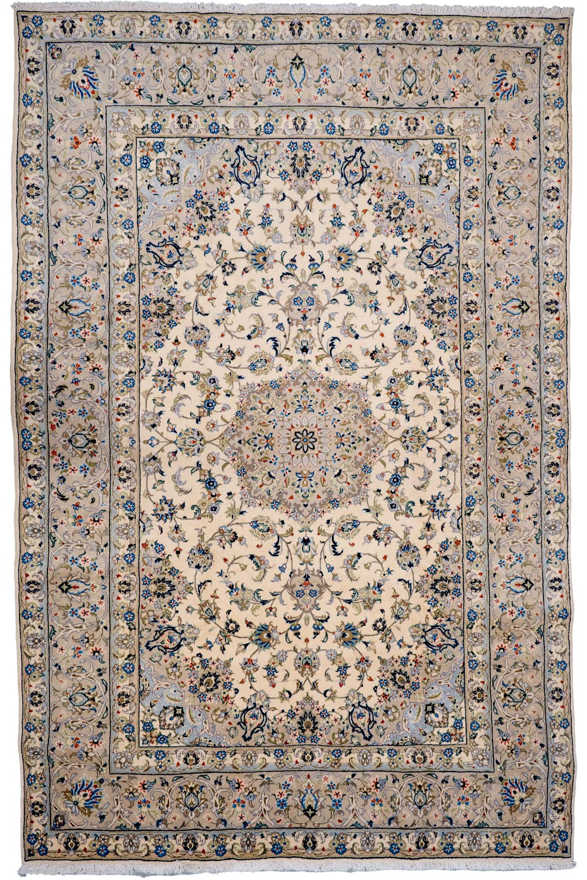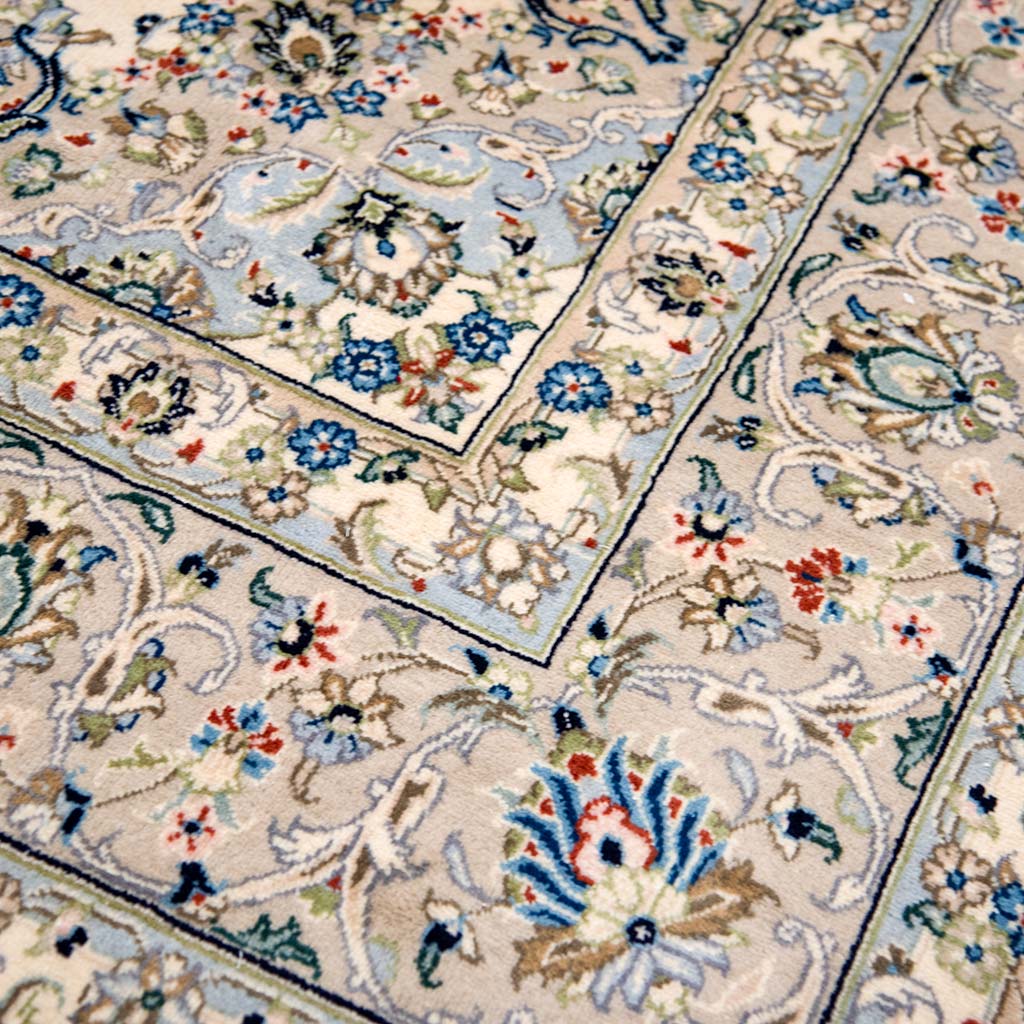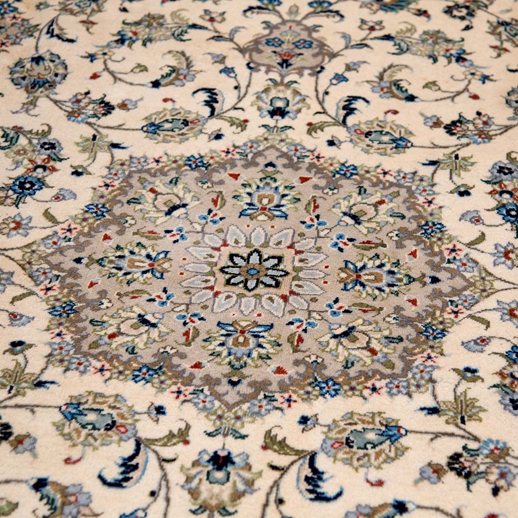 Many Kashan’s are distinctive with their traditional floral designs with deep reds and blues in the centre panel and border. They can also have only small accents of red and a main ground of mostly ivory and navy, making them similar to a Nain but woven in the city of Kashan. Depending on their size and colour they can work very well in both a bedroom as well as a hallway or living room for example.